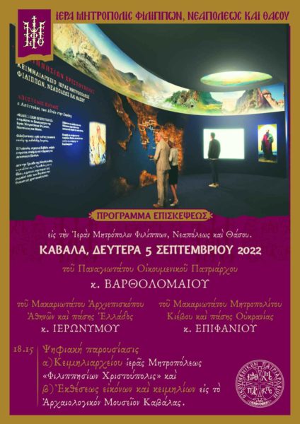 - ΤΟ ΣΑΒΒΑΤΟ 3 ΣΕΠΤΕΜΒΡΙΟΥ στη 1 το μεσημέρι στον Λιμένα τής Θάσου για τήν ΥΠΟΔΟΧΗ : α) τού Οικουμενικού Πατριάρχου κ.κ. ΒΑΡΘΟΛΟΜΑΙΟΥ, τού Αρχιεπισκόπου Αθηνῶν και πάσης Ελλάδος κ.κ. ΙΕΡΩΝΥΜΟΥ, τού Μητροπολίτου Κιέβου και πάσης Ουκρανίας κ.κ. ΕΠΙΦΑΝΙΟΥ, και της Ιεράς Εικόνος τής ΣΥΝΑΞΕΩΣ τών ΑΓΙΩΝ τής ΘΑΣΟΥ, καί β) στίς 2 το μεσημέρι, τήν ίδια μέρα, στόν ιερό Ναό τής Κοιμήσεως τής Θεοτόκου τής ΠΑΝΑΓΙΑΣ ΘΑΣΟΥ όπου θα γίνη η επίσημη ΠΑΤΡΙΑΡΧΙΚΗ ΔΟΞΟΛΟΓΙΑ.
