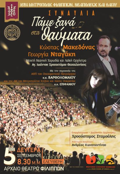 - Στις 9 μ.μ. στό αρχαίο θέατρο τών Φιλίππων στη μουσική Εκδήλωση και Συναυλία για τήν Νεότητα «ΠΑΜΕ ΞΑΝΑ ΣΤΑ ΘΑΥΜΑΤΑ» με τήν συμμετοχή τής μεικτής Χορωδίας και Ορχήστρας τού ιερού Ναού αγίου Ιωάννου τού Χρυσοστόμου Θεσσαλονίκης με ερμηνευτές τόν κ. Κώστα Μακεδόνα και τήν κ. Γεωργία Νταγάκη, και τήν Χορωδία τών μαθητών και μαθητριών τού Μουσικού Σχολείου τής Καβάλας.