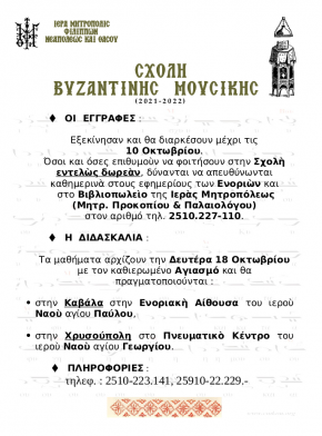 Ξεκίνησαν οι εγγραφές στη Σχολή Βυζαντινής Μουσικής της Ιεράς Μητροπόλεως Φιλίππων και θα διαρκέσουν μέχρι τις 10 Οκτωβρίου.