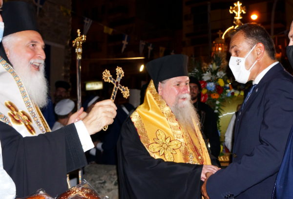 Ο Πολιούχος της Καβάλας τιμήθηκε παρουσία του υπουργού Εθνικής Αμύνης, Νίκου Παναγιωτόπουλου, ο οποίος έγινε δεκτός χθες το απόγευμα από άγημα, αλλά, όπως και οι άλλοι αξιωματούχοι, δεν ακολούθησε την πομπή. Κλήρος και λαός, ωστόσο, ακολούθησαν την εικόνα από το πεζοδρόμιο, τηρώντας το υγειονομικό πρωτόκολλο.