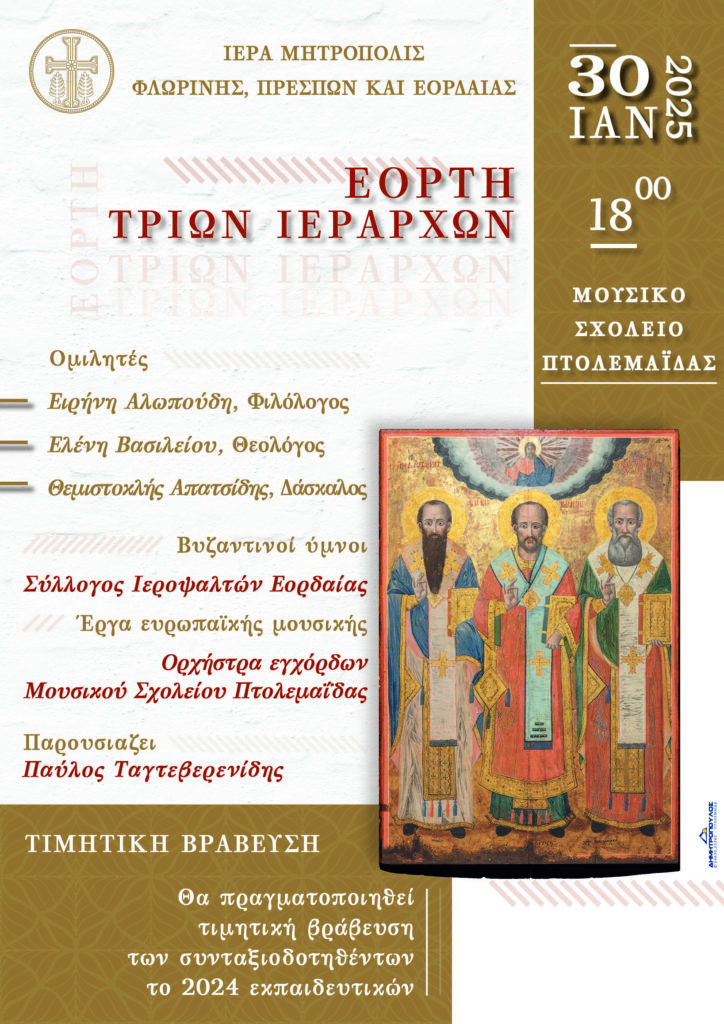 Η Ιερά Μητρόπολη Φλωρίνης, Πρεσπών και Εορδαίας διοργανώνει εκδήλωση με αφορμή την εορτή των Τριών Ιεραρχών, Βασιλείου του Μεγάλου, Γρηγορίου του Θεολόγου και Ιωάννου του Χρυσοστόμου, εφόρων και προστατών των Γραμμάτων.