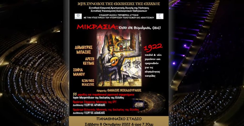 Χίλια ενιακόσια είκοσι δύο (1922) παιδιά και νέοι χορεύουν και τραγουδούν για τις αλησμόνητες πατρίδες! Πενήντα πέντε (55) χορωδίες και παραδοσιακά χορευτικά συγκροτήματα των Ιερών Μητροπόλεων της Εκκλησίας της Ελλάδος θα συμπράξουν με την Ορχήστρα Σύγχρονης Μουσικής της ΕΡΤ και την Ορχήστρα Ελληνικής Μουσικής της Εκκλησίας της Ελλάδος!