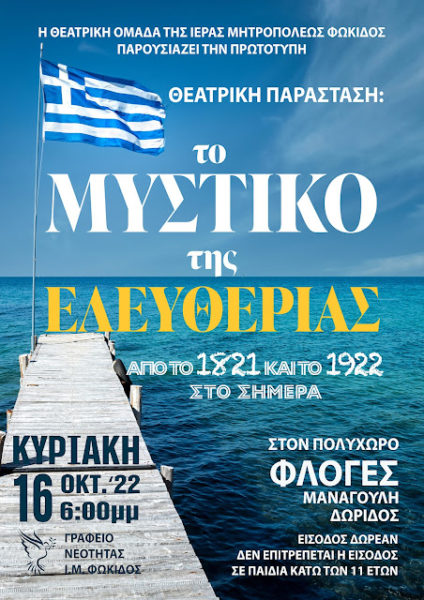 Κοσμοσυρροή αναμένεται την Κυριακή 16 Οκτωβρίου 2022 και ώρα 18:00 στη Μανάγουλη Φωκίδος στον πολυχώρο «Φλόγες», για την θεατρική παράσταση «Το Μυστικό της Ελευθερίας» που παρουσιάζει η Θεατρική Ομάδα της Ιεράς Μητροπόλεως Φωκίδος. Την εκδήλωση διοργανώνει το Κέντρο Νεότητος της Ιεράς Μητροπόλεως.