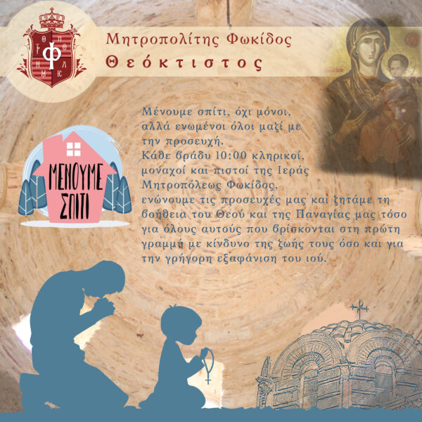 Κάθε βράδυ στις 10:00 ο Πνευματικός σας πατέρας Μητροπολίτης Φωκίδος κ. Θεόκτιστος μαζί με τους κληρικούς, μοναχούς και μοναχές προσευχόμαστε και ζητάμε τη βοήθεια του Θεού και της Παναγίας μας τόσο για όλους αυτούς που βρίσκονται στη πρώτη γραμμή με κίνδυνο της ζωής τους όσο και για την γρήγορη εξαφάνιση του ιού.