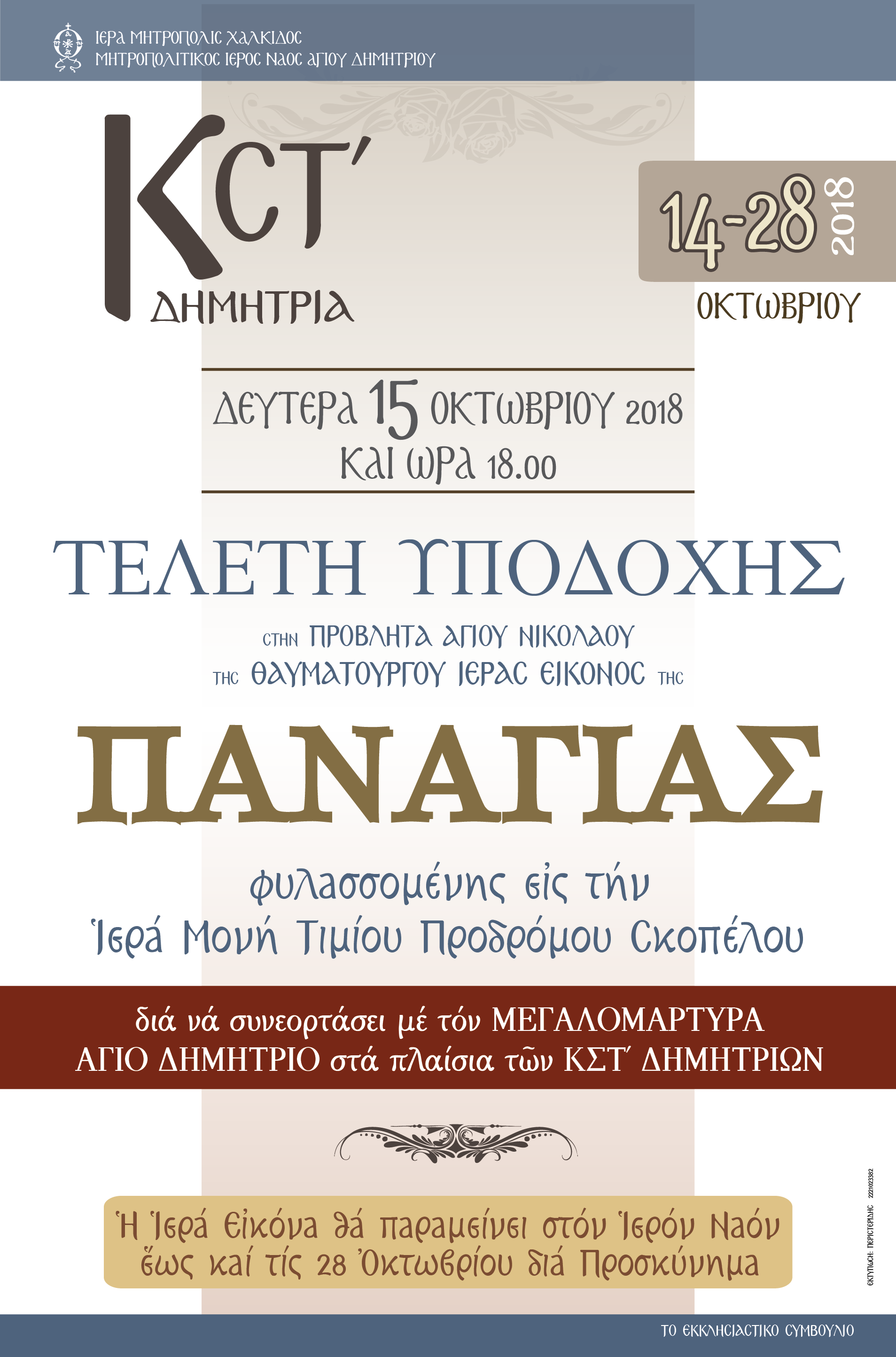 Για εικοστή έκτη συνεχή χρονιά, πρόκειται να πραγματοποιηθούν, με τη Χάρη του Θεού στην Πόλη της Χαλκίδος και συγκεκριμένα στον Μητροπολιτικό Ιερό Ναό του Αγίου Δημητρίου, οι εορταστικές Εκδηλώσεις προς τιμήν του Προστάτου μας Αγίου Μεγαλομάρτυρος Δημητρίου του Μυροβλύτου, με την επωνυμία «ΔΗΜΗΤΡΙΑ».