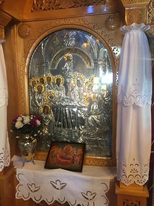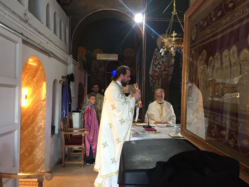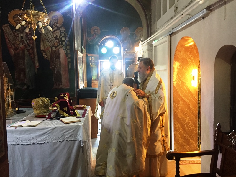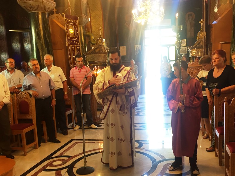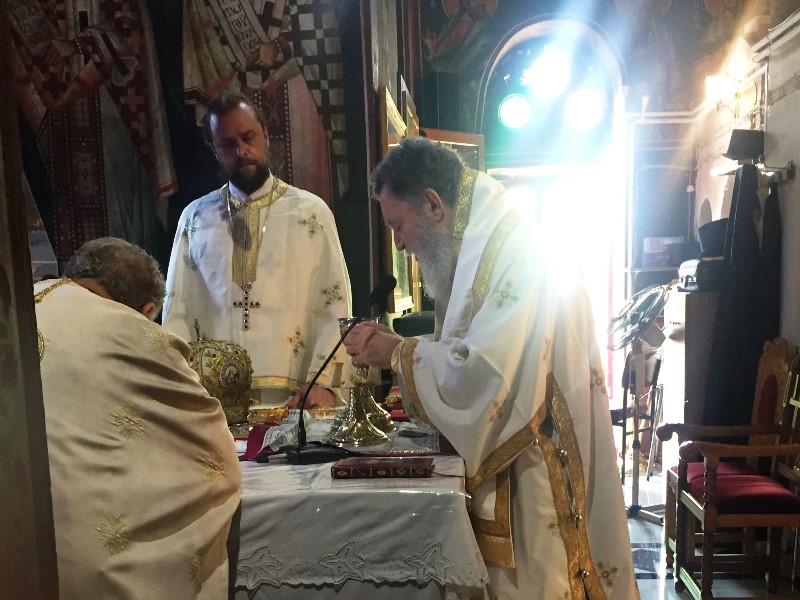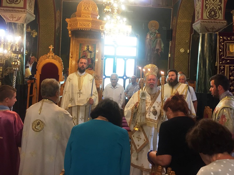 Εκεί και συγκεριμένα στον Ι. Ναό Κοιμήσεως της Θεοτόκου, χοροστάτησε στον Όρθρο και προεξήρχε της Θείας Λειτουργίας, στην οποία συμμετείχε και ο Εφημέριος της Ενορίας Σταυροφ. Γεώργιος Πανώργιας.