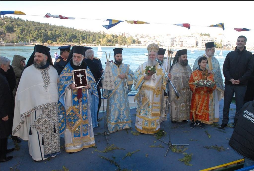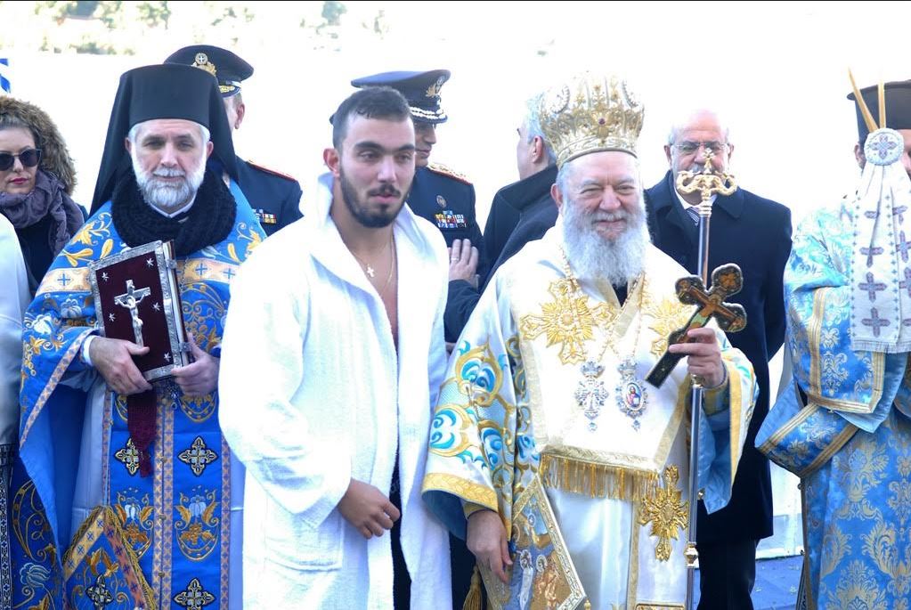 Μετά την ανάγνωση του Ευαγγελίου και την Δέηση που ανεπέμφθη, ο Σεβασμιώτατος έψαλλε το τροπάριο των Θεοφανείων «Εν Ιορδάνη βαπτιζομένου σου Κύριε…» και δεκατρείς γενναίοι κολυμβητές έπεσαν στη θάλασσα και το Σταυρό ανέσυρε, για δεύτερη συνεχόμενη χρονιά, ο φοιτητής κ. Χρήστος Μπόνιας, ο οποίος παρέλαβε από τον Σεβασμιώτατο ένα χρυσό Σταυρό, ενώ οι υπόλοιποι δώδεκα κολυμβητές από ένα ασημένιο Σταυρό.