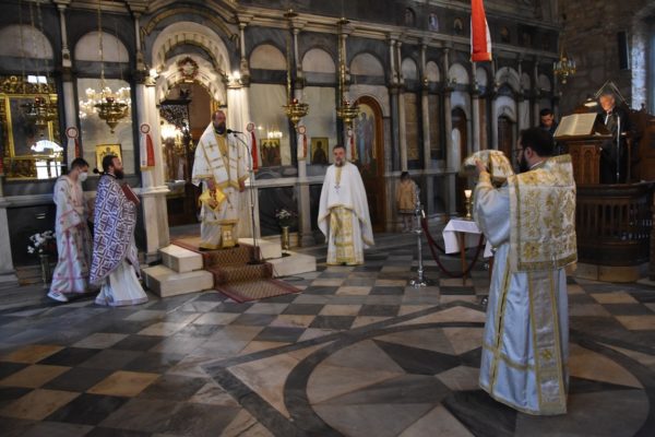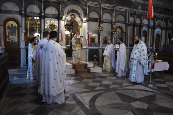 Στην Θεία Λειτουργία, η οποία μεταδόθηκε απευθείας από τον Ραδιοφωνικό Σταθμό της Ι. Μητροπόλεως, έψαλλαν οι ιεροψάλτες του Ι. Ναού κ. Κωνσταντίνος Σιάνος και κ. Νικόλαος Βαβίλης.