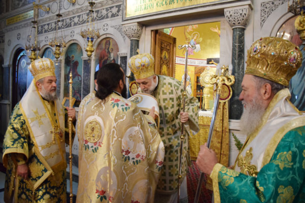 Συλλειτουργοί του Θεοφιλεστάτου ήταν ο αυτάδελφός του Σεβασμιώτατος Μητροπολίτης Γόρτυνος κ. Νικηφόρος, ο Σεβασμιώτατος Ποιμενάρχης, Μητροπολίτης Χαλκίδος κ. Χρυσόστομος, οι αρχιμ. Γαβριήλ Εμμανουηλίδης-καθηγούμενος της Ι. Μονής Οσίου Δαυΐδ, Μεθόδιος Φουντούλης-εφημέριος του Προσκυνηματικού Ι. Ναού Παναγίας Φανερωμένης Ν. Αρτάκης, ο πρωτοποπρεβ. Νικόλαος Αναστασίου-εφημέριος της Ενορίας Ροβιών και ο αρχιδιάκ. Σταύρος Καλαφάτης.