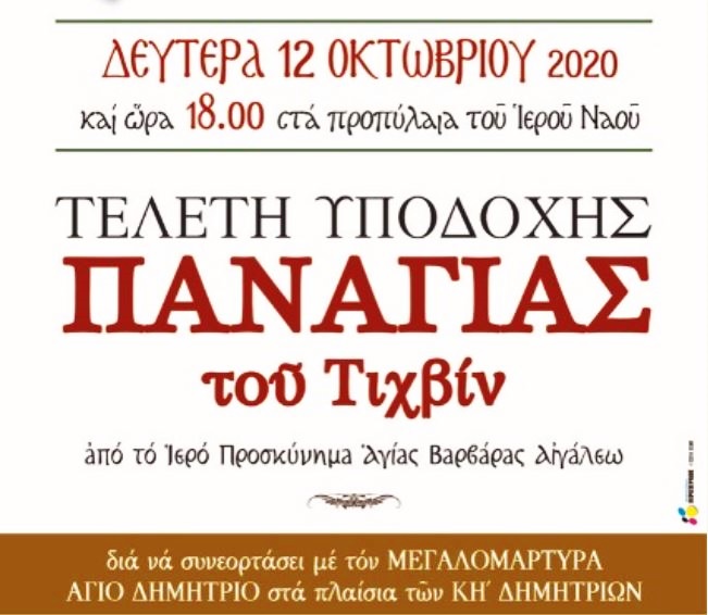 Η υποδοχή της Θαυματουργού Ιεράς Εικόνος της Παναγίας του Τιχβίν, θα πραγματοποιηθεί την Δευτέρα 12 Οκτωβρίου 2020 και ώρα 18:00 στα προπύλαια του Μητροπολιτικού Ιερού Ναού Αγ. Δημητρίου Χαλκίδος, με προεξάρχοντα του Ιερού Κλήρου και του ευσεβούς Λαού, τον Σεβασμιώτατο Μητροπολίτη Χαλκίδος κ. Χρυσόστομο.