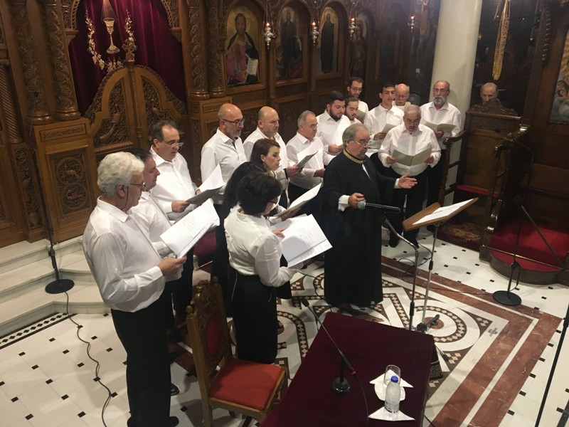 Στη συνέχεια, χορός ιεροψαλτών, με χοράρχη τον επίσης εκλεκτό Φιλόλογο, πρωτοψάλτη του Προσκυνηματικού Ι. Ν. Παναγίας Φανερωμένης Ν. Αρτάκης και καθηγητή της Σχολής Βυζαντινής Μουσικής της Ι. Μητροπόλεως, κ. Άγγελο Μαντά, απέδωσε αντιπροσωπευτικούς ύμνους από ακολουθίες Αγίων που συνέθεσε ο Μωραϊτίδης.
