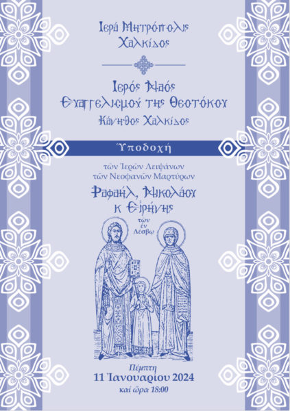 Για δωδέκατη συνεχόμενη χρονιά η τοπική Εκκλησία της Χαλκίδος πρόκειται να υποδεχθεί και να φιλοξενήσει αποτμήματα των ιερών λειψάνων των Αγίων Νεομαρτύρων της Λέσβου, Ραφαήλ, Νικολάου και Ειρήνης.