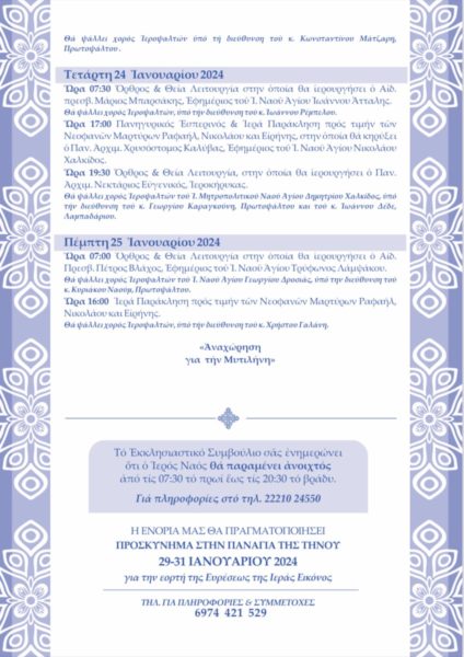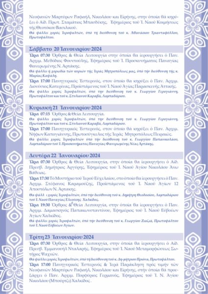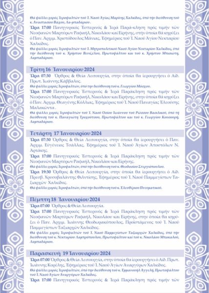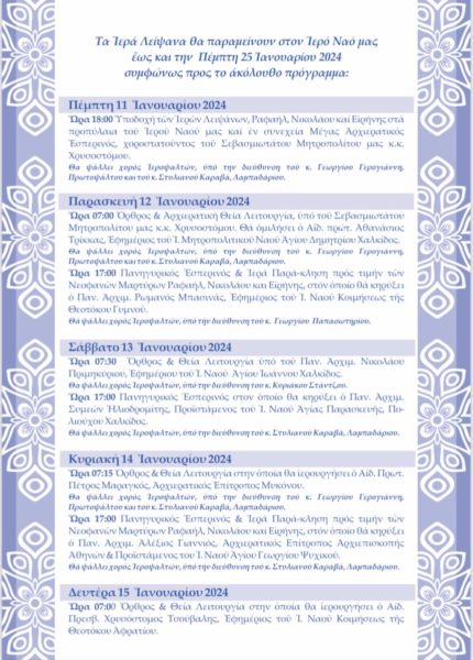 Ακολουθεί το πλήρες πρόγραμμα παραμονής των ιερών λειψάνων των Αγίων Ραφαήλ Νικολάου και Ειρήνης.