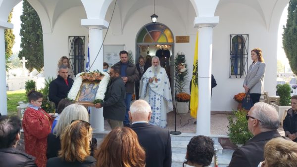Μετά το πέρας της Θείας Ευχαριστίας ακολούθησε η λιτάνευση της εικόνος πέριξ του ιερού ναού και το τρισάγιο υπέρ αναπαύσεως των κεκοιμημένων.