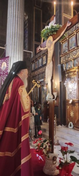 Το πρωί της Μεγάλης Παρασκευής, αφού ο Σεβασμιώτατος προσκύνησε τον Επιτάφιο της Ενορίας Αγίας Παρασκευής πολιούχου Χαλκίδος, η οποία εκπληρώνει τις λατρευτικές της ανάγκες στην αίθουσα εκδηλώσεων της Ιεράς Μητροπόλεως μέχρι την ολοκλήρωση των αναστηλωτικών έργων του παλαιοχριστιανικού Ιερού Ναού της, μετέβη στον Ιερό Ναό Αγίου Νικολάου Χαλκίδος, όπου συμπροσευχήθηκε από του Ιερού Βήματος κατά τις Ακολουθίες των Μεγάλων Ωρών, τις οποίες τέλεσαν οι Ιερείς του Ναού αρχιμ. Χρυσόστομος Καλύβας-ιεροκήρυκας και πρωτοπρεσβ. Ηλίας Αγιαννίτης και εν συνεχεία χοροστάτησε στον Εσπερινό της Αποκαθηλώσεως, με την παρουσία των ανωτέρω Κληρικών και των διακ. Σταύρου Καλαφάτη και Ανθίμου Παπαϊωάννου, με την συμμετοχή πολλών ευσεβών χριστιανών, που μέχρι αργά το απόγευμα συνέρρεαν να προσκυνήσουν τον ιερό Επιτάφιο.