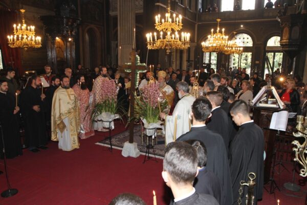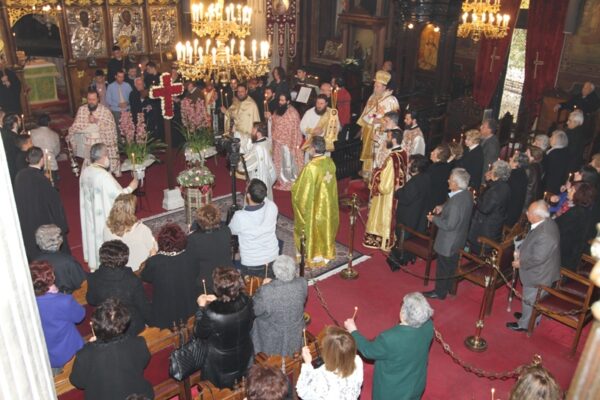 Το πρώτο και κύριο μέρος της Συνάξεως ήταν η αρχιερατική θεία λειτουργία στον Ιερό Ναό Αγίου Νικολάου Χαλκίδος. Προ της ενάρξεώς της, στο τέλος του Όρθρου, σύμφωνα με την τάξη της Εκκλησίας, έγινε και η τελετή της Λιτάνευσης και Προσκύνησης του Τιμίου Σταυρού, υπό του Σεβασμιωτάτου Μητροπολίτου Χαλκίδος κ. Χρυσοστόμου, με τη συμμετοχή Κληρικών της Ιεράς μας Μητροπόλεως, όπως και πυκνού εκκλησιάσματος.
