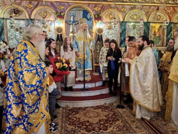 Λίγο πριν την απόλυση, ο Σεβασμιώτατος απένειμε επαίνους στους μαθητές του Κατηχητικού Σχολείου της Ενορίας Ευαγγελία Μπαζίγου, Φίλιππο Αντωνίου και Αντωνία Μπαζίγου, οι οποίοι διακρίθηκαν στον διαγωνισμό ζωγραφικής, που διοργάνωσε, το περασμένο έτος, η Ιερά Μητρόπολη Χαλκίδος με την ευκαιρία συμπληρώσεως εκατό ετών από την έλευση του ιερού σκηνώματος του Οσίου Ιωάννου του Ρώσσου στην Εύβοια, ενώ, κλείνοντας ευχήθηκε πατρικά σε όσες και όσους εορτάζουν.