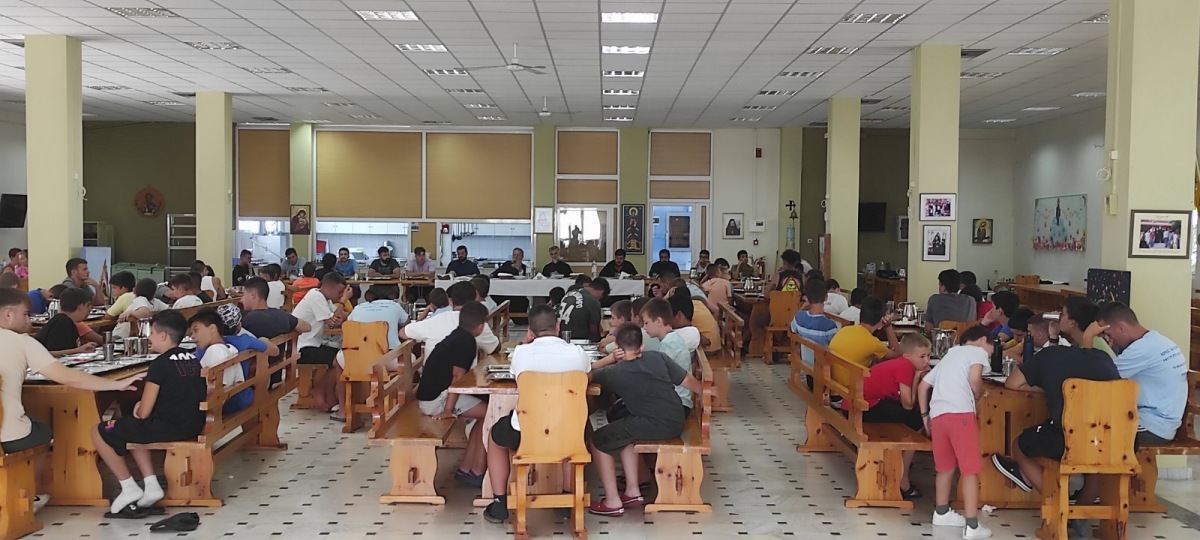 Το μεσημέρι ο Σεβασμιώτατος γευμάτισε με τους κατασκηνωτές. Κατά το γεύμα, ο Αρχηγός π. Θεοφύλακτος, καλοσωρίζοντας τον Σεβασμιώτατο και τους συνοδούς του Κληρικούς παρουσιάζοντας τα στελέχη που εθελοντικά προσφέρουν τις υπηρεσίες τους, ανέφερε ότι η γενική θεματική ονομασία της κατασκηνωτικής περιόδου είναι «Η φωλιά των Ευβοέων Αγίων» και έχει στόχο τη γνωριμία των παιδιών με τους τοπικούς Αγίους της Εύβοιας, ενώ, αμέσως μετά, τα παιδιά κατά ομάδες τραγούδησαν τους ύμνους των ομάδων τους και άλλα τραγούδια, καλωσορίζοντας, με τον δικό τους τρόπο, και συγκινώντας τον Πνευματικό τους πατέρα και Μητροπολίτη τους.