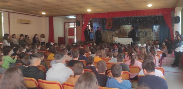 Ο Διευθυντής του Σχολείου κ. Θεοδόσιος Κουκουβίνος καλωσόρισε τον Σεβασμιώτατο, ο οποίος ευχαρίστησε για την πρόσκληση που του απηύθυναν και, κατόπιν, ανέλυσε με απλό και διδακτικό λόγο, στους μαθητές, το θεολογικό νόημα της εικόνας της γεννήσεως του Χριστού, όπως την αποτυπώνει η πατροπαράδοτη τέχνη της βυζαντινής αγιογραφίας.