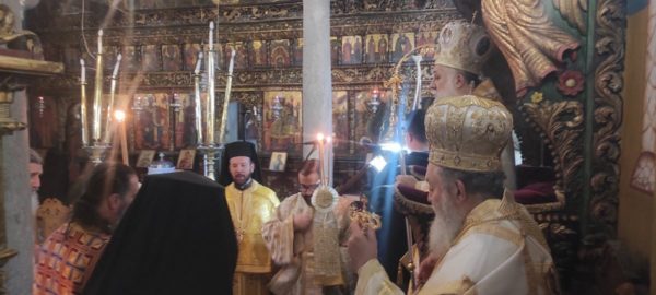 Στον αναστάσιμο πανηγυρικό Εσπερινό χοροστάτησε ο Θεοφιλέστατος Επίσκοπος Σκοπέλου κ. Νικόδημος συμπαραστατούμενος από τον Σεβασμιώτατο Μητροπολίτη Χαλκίδος κ. Χρυσόστομος και πλαισιούμενος από σύσσωμο το ιερατείο της Σκοπέλου και πλήθος προσκυνητών που είχαν κατακλύσει το καθολικό και το προαύλιο της Ι. Μονής.