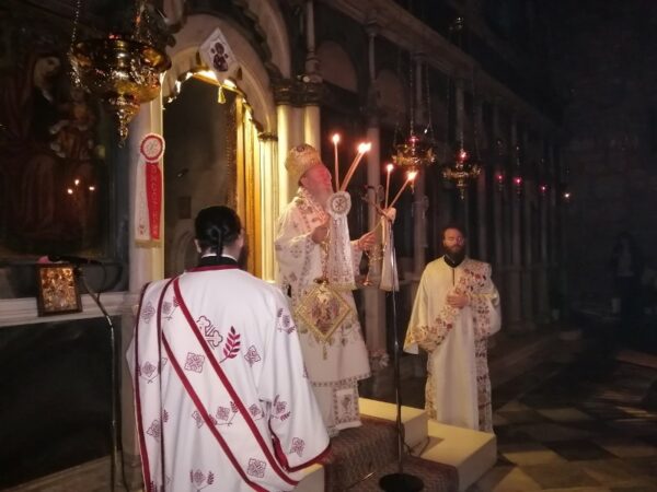 Συγκεκριμένα, την Παρασκευή 24 Μαΐου 2019 το βράδυ, στον Ι. Ναό της Αγίας Παρασκευής Πολιούχου Χαλκίδος, ο Σεβασμιώτατος, πλαισιωμένος από τους Ιερείς του Ι. Ναού, Αρχιμ. Συμεών Ηλιοδρομίτη – Προϊστάμενος και Διευθυντής του Γηροκομείου Χαλκίδος, Οικον. Ιωάννη Φαφούτη και Πρεσβ. Γεώργιο Καλαφάτη και τους Διακ. Νικόλαο Πριμηκύριο και Ευγένιο Τσάλλα, χοροστάτησε στις ιερές ακολουθίες του Εσπερινού και του Όρθρου, ενώ στην συνέχεις τέλεσε την Θεία Λειτουργία.