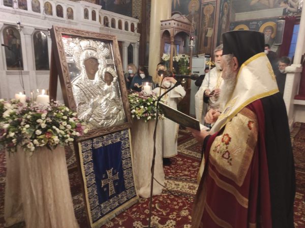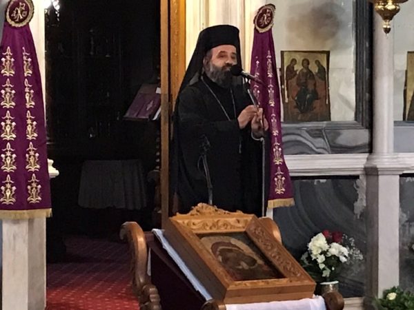 Την Παρασκευή 1 Απριλίου το απόγευμα μετέβη στον Προσκυνηματικό Ι. Ναό Παναγίας Φανερωμένης Ν. Αρτάκης, όπου, πλαισιούμενος από τους συνοδούς τους Κληρικούς και τους Αρχιμ. Μεθόδιο Φουντούλη-Εφημέριο του Ι. Προσκυνήματος και τον Διάκ. Σταύρο Καλαφάτη, χοροστάτησε στην Ακολουθία των Χαιρετισμών, έψαλλε την τέταρτη Στάση του Ακαθίστου ύμνου ενώπιον της θαυματουργού εικόνος της Παναγίας Φανερωμένης και κήρυξε τον θείο λόγο προς τους εκκλησιασθέντες χριστιανούς αναπτύσσοντας συμβολισμούς της Θείας Ευχαριστίας, με έναυσμα την παρομοίωση της Θεοτόκου ως εμψύχου τραπέζης, η οποία φέρει τον Άρτο της ζωής.