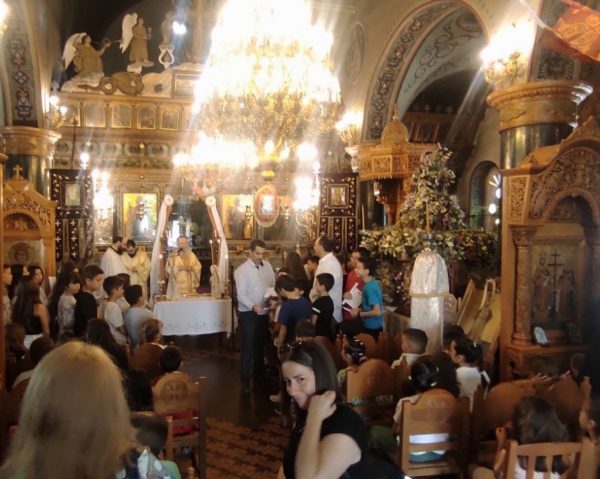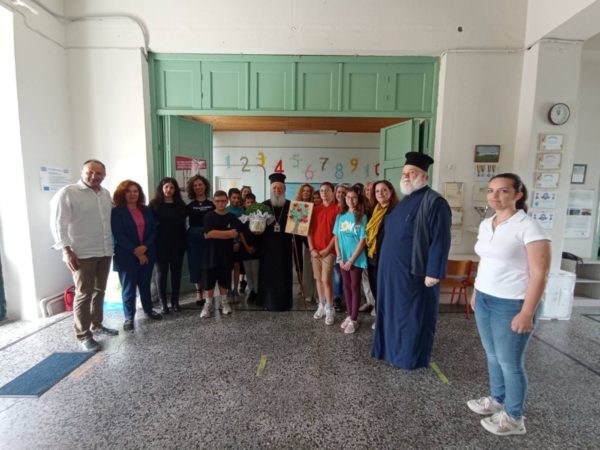 Μετά, στην αυλή της εκκλησίας παρατέθηκε δεξίωση για όλους, κατά την οποία καθηγητές, γονείς και μαθητές είχαν την ευκαιρία δημιουργίας ζεστού και εποικοδομητικού διαλόγου με τον Πνευματικό τους πατέρα και Μητροπολίτη τους.