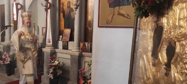 Το Σάββατο το πρωί, ο Σεβασμιώτατος, αφού αφίχθηκε στο νησί, μετέβη για προσκύνημα στις Ι. Μονές Αγίας Μόνης και Μυρτιδίων, που φυλάσσεται η έφορος του νησιού Παναγία Μυρτιδιώτισσα.