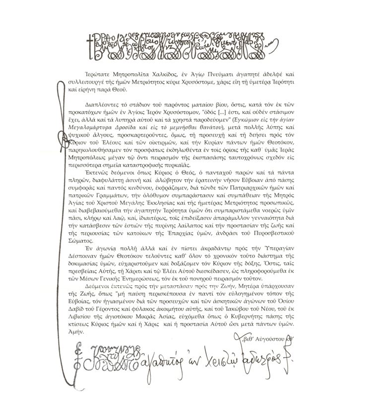 Την επιστολή έδωσε στη δημοσιότητα η Ιερά Μητρόπολη Χαλκίδος