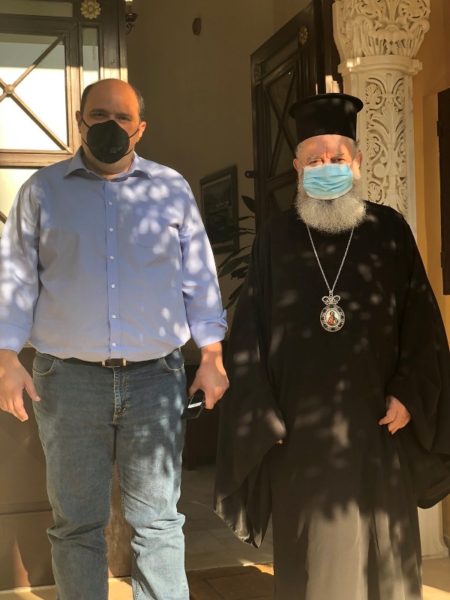 Μαζί με τον Σεβασμιώτατο στα Γραφεία της Ι. Μητροπόλεως υποδέχθηκαν τον κ. Υφυπουργό και οι Αρχιμ. Νικόδημος Ευσταθίου, Πρωτοσύγκελλος, και Νικηφόρος Ευσταθίου, Γενικός Αρχιερατικός Επίτροπος της Ι. Μητροπόλεως.