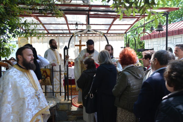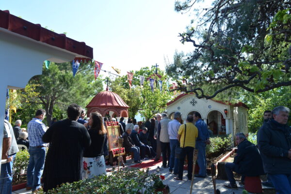 Ἀποβραδὺς μετὰ τὸν πανηγυρικὸν ἑσπερινὸν ἐψάλησαν τὰ ἐγκώμια τοῦ Ἁγίου καὶ λιτανεύθηκε ἡ εἰκόνα μετὰ τοῦ ἱεροῦ λειψάνου τοῦ Ἁγίου μέσα εἰς τὴν εὐωδιάζουσαν ἐαρινὴν ἑσπέραν μὲ πλήρη νηνεμία. Εἰς τὴν τράπεζαν ποὺ παρετέθη παρεκάθησαν καὶ συνευφράνθησαν ἑκατοντάδες συμπανηγυριστῶν.