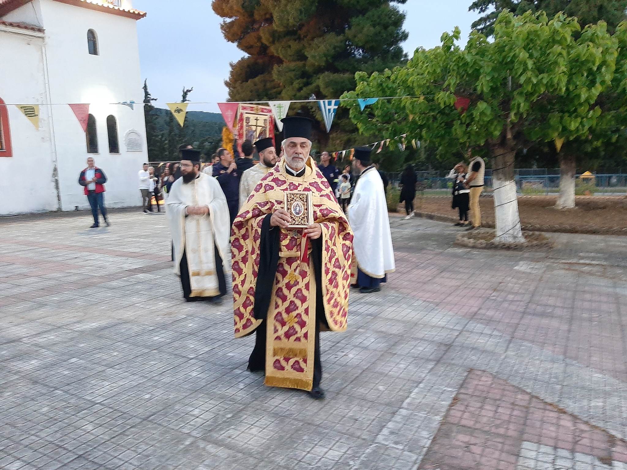 Μετά το πέρας του Πανηγυρικού Εσπερινού ακολούθησε η λιτανεία της εικόνος την οποία πλαισίωσαν η Εθελοντική Ομάδα Δασοπυρόσβευσης Αμαρυνθία Αρτεμις με τα μέλη του χορευτικού Πολιτιστικού Συλλόγου Νέας Αρτάκης.