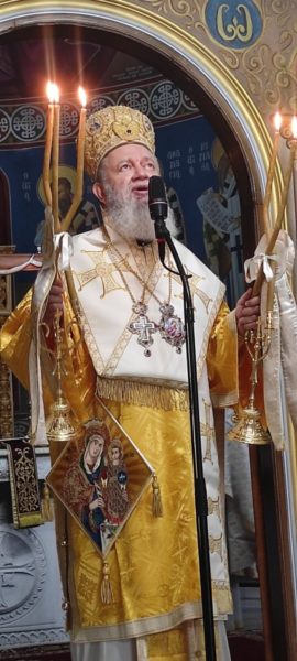 Επίσης, λίγο πριν το τέλος του κηρύγματός του, ο Σεβασμιώτατος κ. Χρυσόστομος επαίνεσε τον π. Ιωάννη για το έργο της κατηχήσεως και διακονίας των νέων που επιτελεί στην Ενορία και εξέφρασε τη χαρά του, διότι πολλά παιδιά καθ’όλη τη διάρκεια της Θείας Λειτουργίας διηκόνησαν στο Ιερό Βήμα, απήγγειλαν το Σύμβολο της Πίστεως και το «Πάτερ ημών» και μετάλαβαν των Αχράντων Μυστηρίων.