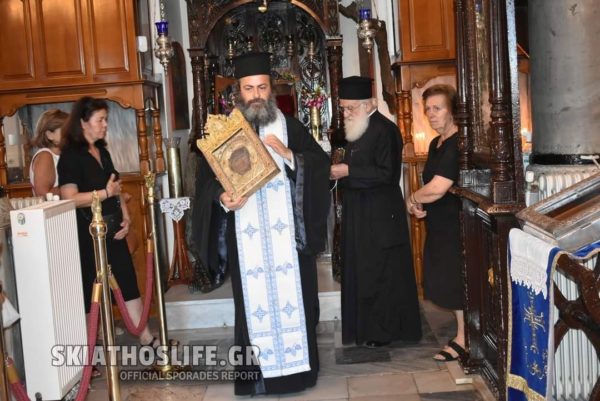 Μετά την απόλυση έλαβε χώρα η λιτάνευση του θαυματουργού εικονίσματος της Παναγίας ανά τας οδούς της Σκιάθου και η εναπόθεσή του στον Ενοριακό Ιερό Ναό Τριών Ιεραρχών, όπου, ως ιερό παλλάδιο, φυλάσσεται καθ’ όλο τον χρόνο.