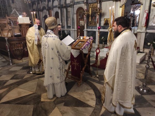 Κατά την διάρκεια της Αγρυπνίας, προετέθη προς προσκύνηση Ιερό Ένδυμα του Οσίου Ιωάννου, το οποίο φυλάσσεται στο Ιερό Μητροπολιτικό Παρεκκλήσιο του Ευαγγελισμού της Θεοτόκου του Επισκοπείου και μετεφέρθη στον Ι. Ναό γι’ αυτό το λόγο.