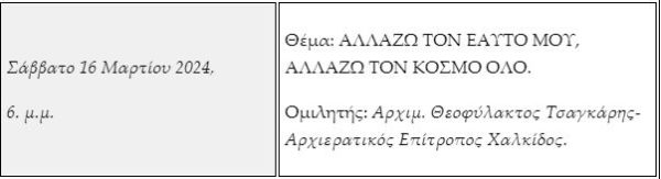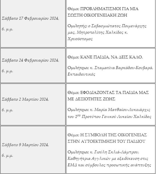 Το Σάββατο 3 Φεβρουαρίου 2024, το απόγευμα, στην Αίθουσα του Πολιτιστικού-Πνευματικού Κέντρου της Ιεράς Μητροπόλεως Χαλκίδος (Αχαΐας & Κυκλάδων), πραγματοποιήθηκε η πρώτη διάλεξη του εφετινού κύκλου συνάξεων της Σχολής Γονέων της Ιεράς Μητροπόλεως Χαλκίδος, με ομιλήτρια την κ. Βασιλική Κόντου-αρμόδια Αντιδήμαρχο για θέματα Υγείας, Ατόμων με αναπηρία και Εθελοντισμού, με θέμα: «Γονείς και δύσκολα παιδιά».