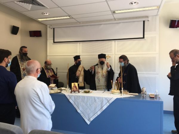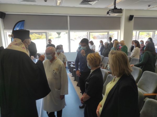 Τον υποδέχθηκαν ο Διοικητής κ. Ευάγγελος Χατζημαργαρίτης με μέλη του Διοικητικού Προσωπικού του Νοσοκομείου και τέλεσε το Μυστήριο του ιερού Ευχελαίου, συνοδευόμενος από τον Αρχιμ. Ιωάννη Καραμούζη-Ιεροκήρυκα, τον Αρχιμ. Αιμιλιανό Χρήστου-Προϊστάμενο του Μητροπολιτικού Ι. Ν. Αγ. Δημητρίου Χαλκίδος, τον Πρεσβ. Αντώνιο Ρίζο και τον Διάκ. Σταύρο Καλαφάτη, χρίοντας όσους επιθυμούσαν με το Άγιο Ευχέλαιο.