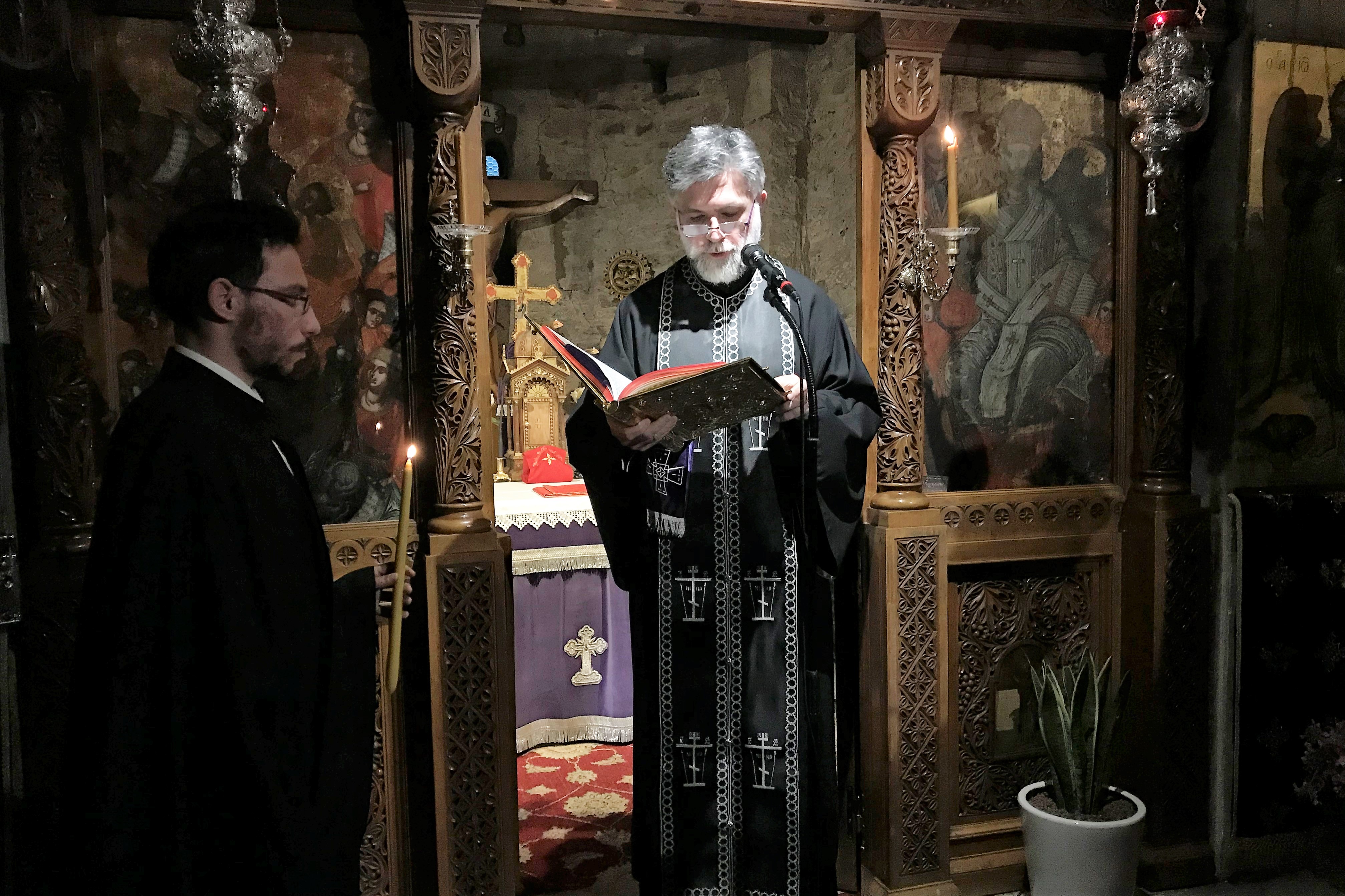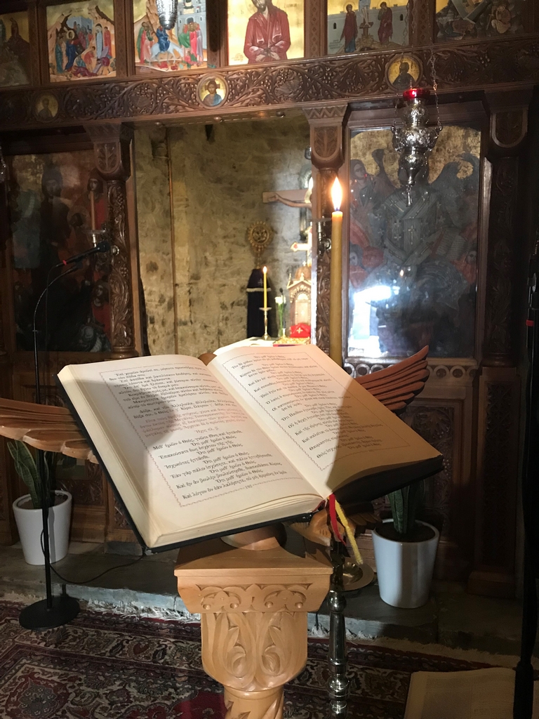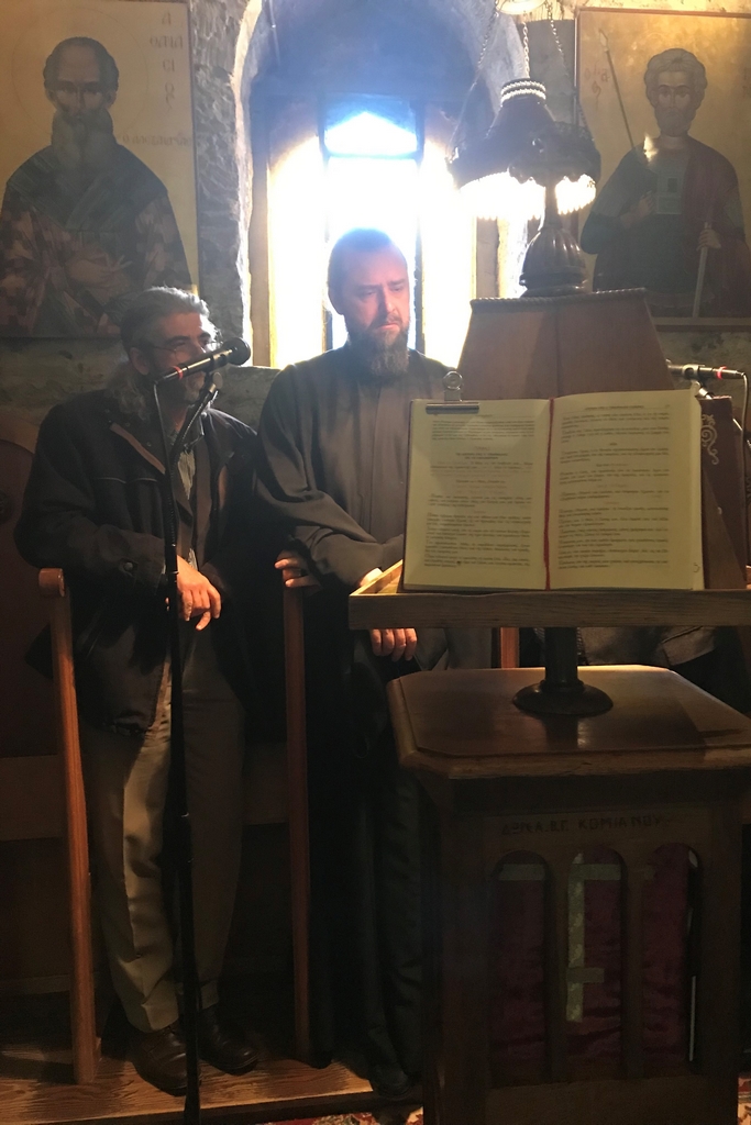 Εκεί, ο Σεβασμιώτατος χοροστάτησε στην Ακολουθία του Μεγάλου Αποδείπνου και έψαλλε μαζί με τους πατέρες και τους Ιεροψάλτες το προβλεπόμενο τμήμα του Μεγάλου Κανόνος.
