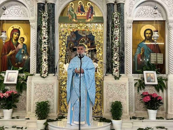 Τον θείο λόγο κήρυξε ο Πρωτοσύγκελλος π. Νικόδημος Ευσταθίου, ο οποίος αναφέρθηκε στην εκπλήρωση της υποσχέσεως την οποία ο Κύριος είχε δώσει στους μαθητές του λίγο πριν από το πάθος, όταν τους προανήγγειλε την αναχώρηση του από αυτό τον κόσμο, διά του Σταυρού και της Αναστάσεως του. Τότε τους είπε δεν θα σας αφήσω ορφανούς, αλλά απερχόμενος θα σας στείλω το άγιο Πνεύμα.