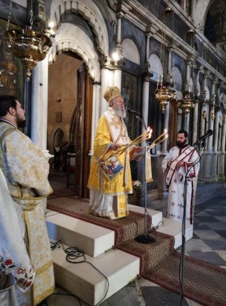 Τα ιερά αναλόγια διηκόνησαν οι Ιεροψάλτες του Ι. Ναού, Κωνσταντίνος Σιάνος και Νικόλαος Βαβίλης με τις χορωδίες τους και το σύνολο των ιερών ακολουθιών μεταδόθηκε ζωντανά από τον Ραδιοφωνικό Σταθμό της Ιεράς Μητροπόλεως (97,7 fm).
