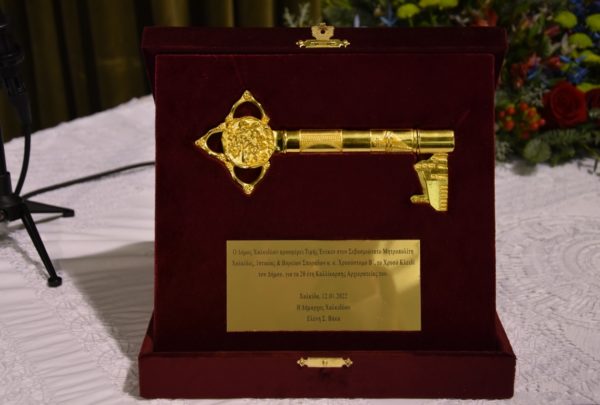 Εν συνεχεία, επέδωσε στον Σεβασμιώτατο Ποιμενάρχη το χρυσό κλειδί της Πόλεως, ύψιστη τιμητική διάκριση του Δήμου και τον κάλεσε να κλείσει με τον πάντοτε μεστό λόγο του την εκδήλωση.