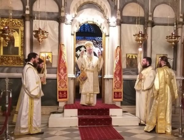 Στη συνέχεια εψάλλη η Ακολουθία του Όρθρου, ετελέσθη η Αρχιερατική χοροστασία και ακολούθησε η Αρχιερατική Θεία Λειτουργία, στην οποία οι πιστοί μετείχαν.