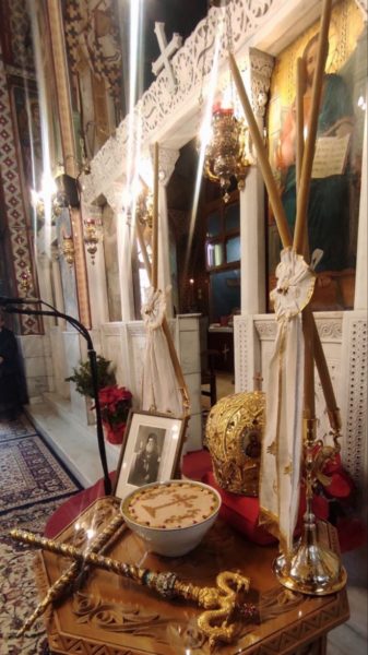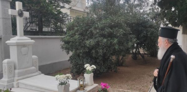Μετά την απόλυση της Θείας Λειτουργίας και το τελεσθέν μνημόσυνο, ο Σεβασμιώτατος τέλεσε τρισάγιο επί του τάφου του μακαριστού Μητροπολίτου.