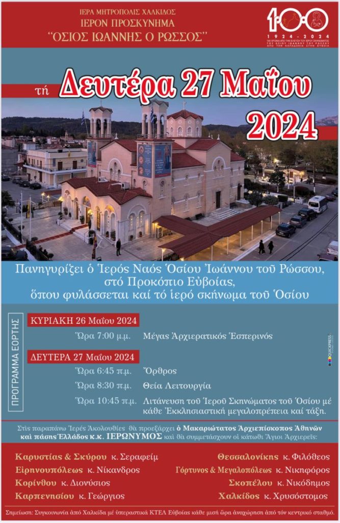17/05/2024 17/05/2024 Με πολλή συγκίνηση και ανείπωτη χαρά,  πριν την Εσπερινή Ακολουθία, το Νέο Προκόπιο Ευβοίας θα υποδεχθεί στο Ιερό Προσκύνημα του Οσίου Ιωάννου του Ρώσσου το δεξιό άφθαρτο χέρι του Οσίου Ιωάννου, την παραμονή της μνήμης του Αγίου, Κυριακή 26 Μαΐου, στις 19:00. Το δεξιό άφθαρτο χέρι του Οσίου Ιωάννου, όπως είναι γνωστό, λείπει, μέχρι σήμερα, από...