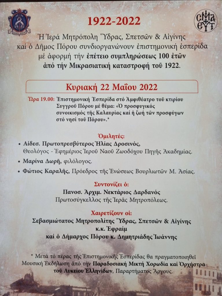 Η Ιερά Μητρόπολη Ύδρας, Σπετσών και Αιγίνης και ο Δήμος Πόρου συνδιοργανώνουν επιστημονική εσπερίδα με αφορμή την επέτειο συμπλήρωσης 100 ετών από την Μικρασιατική Καταστροφή του 1922, την Κυριακή 22 Μαΐου στις 19:00.