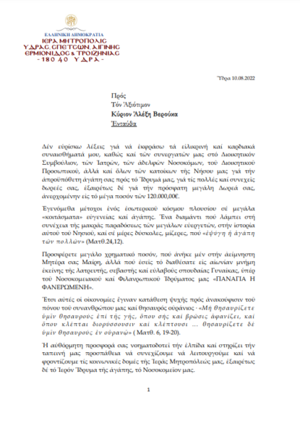 Ευχαριστήρια επιστολή στον Αλέξη Βερούκα για τη δωρεά στο Κουλούρειο Νοσοκομείο Ύδρας