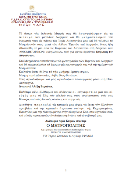Ευχαριστήρια επιστολή απέστειλε ο Σεβασμιώτατος Μητροπολίτης Ύδρας, Σπετσών και Αιγίνης κ. Εφραίμ στον εικαστικό Αλέξη Βερούκα για τη μεγάλη δωρεά των 120.000 ευρώ προς το Κουλούρειο Νοσοκομείο Ύδρας “ΠΑΝΑΓΙΑ Η ΦΑΝΕΡΩΜΕΝΗ” και τις άλλες δωρεές του. «Οι οικονομίες που έγιναν κατάθεση ψυχής», αναφέρει χαρακτηριστικά ο Σεβασμιώτατος για τα χρήματα που δώρισε ο εικαστικός…