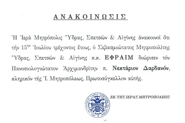 Την 15η Ιουλίου, ο Μητροπολίτης Ύδρας, Σπετσών και Αιγίνης κ. Εφραίμ προχώρησε στον διορισμό νέου Πρωτοσυγκέλλου της Ιεράς Μητροπόλεως, ορίζοντας στη κρίσιμη αυτή θέση τον Αρχιμ. π. Νεκτάριο Δαρδανό.