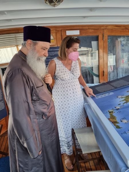 Το απόγευμα της ιδίας ημέρας ο Σεβασμιώτατος Μητροπολίτης Ύδρας, Σπετσών και Αιγίνης κ. Εφραίμ συνοδευόμενος από τον Πρωτοσυγκέλλο ,τον Γενικό Αρχιερατικό Επίτροπο και τον Διάκονο, επισκέφθηκε την Έκθεση και ξεναγήθηκε στον χώρο του πλοίου.