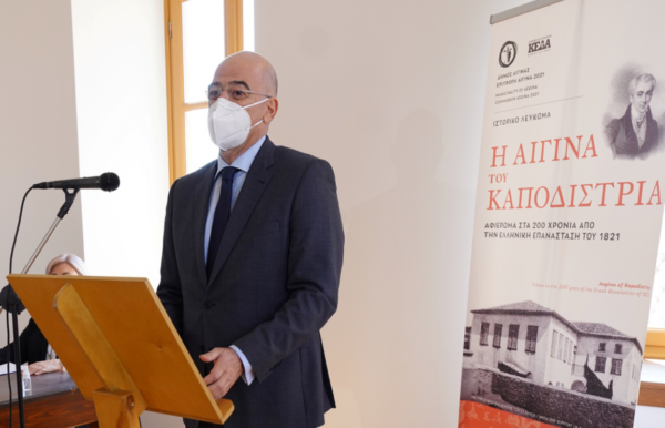 Την Αίγινα επισκέφθηκε σήμερα το πρωί, Παρασκευή 26 Μαρτίου 2021, ο υπουργός Εξωτερικών Νίκος Δένδιας στο πλαίσιο εκδήλωσης για την παρουσίαση του ιστορικού λευκώματος με τίτλο η “Αίγινα του Καποδίστρια”.